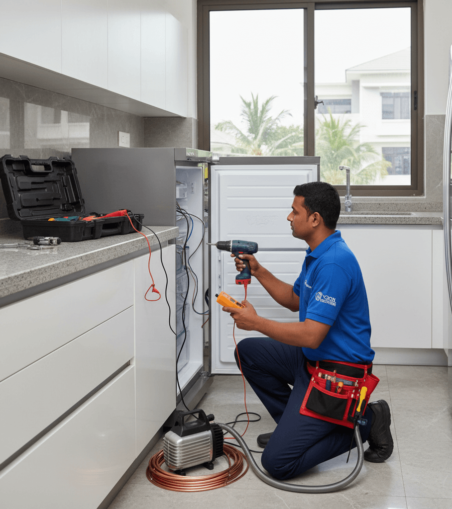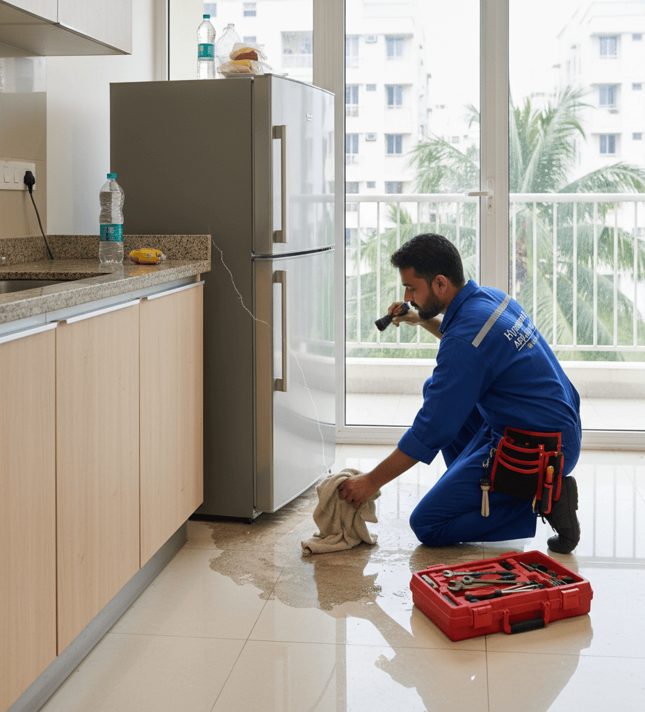 Technician repairing refrigerator inside Kolkata apartment kitchen